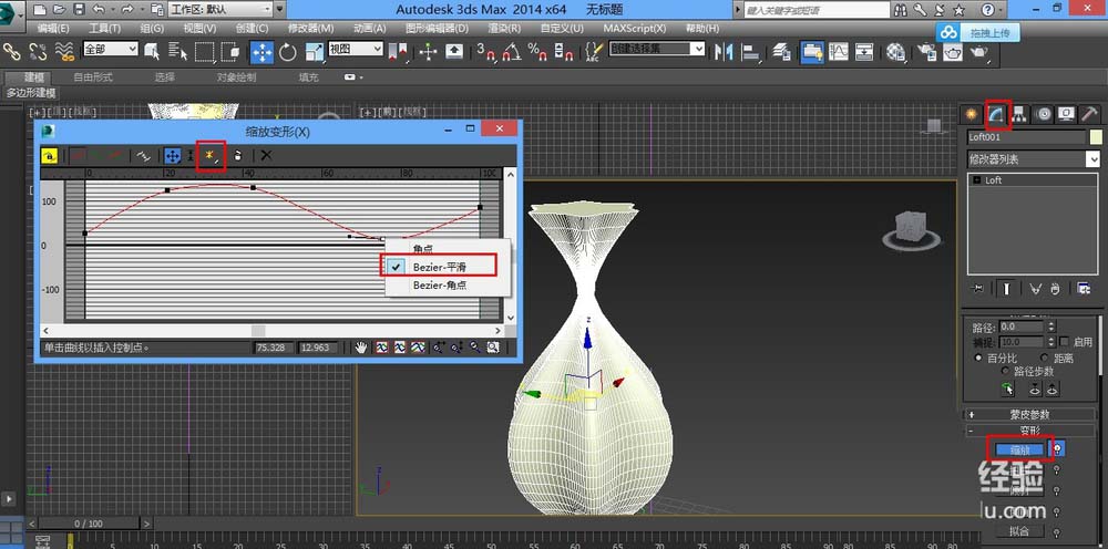 4、然后选择几何体,点击修改,变形下面的缩放,在上面添加点,右击点,转化成平滑角点,调节点如图下位置,可以看到初步显示出瓶子的形状了