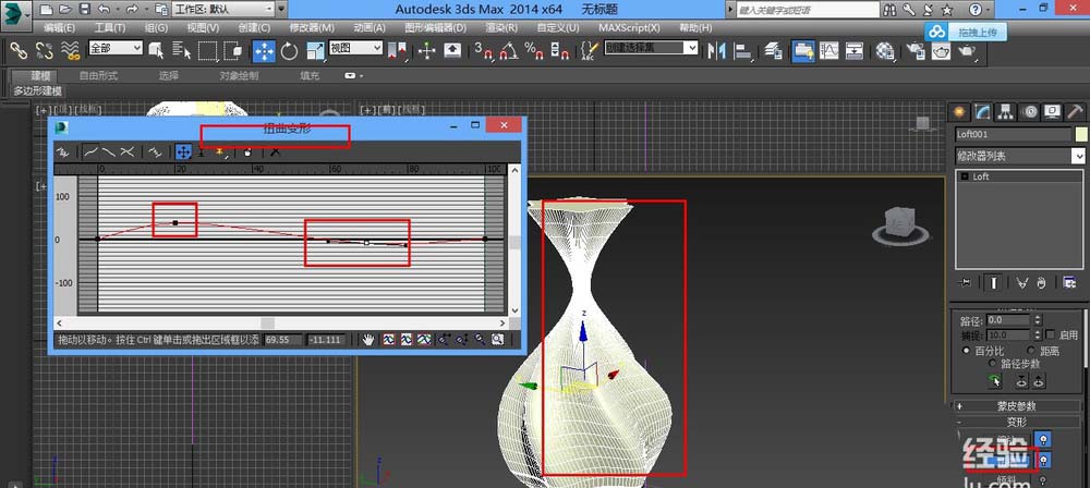 5、在点击变形下面的扭曲,用同样的方法调节点,可以看到瓶子扭曲了