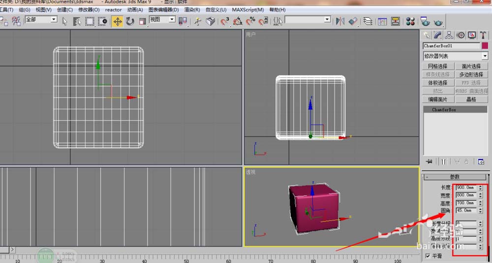 2、输入如图这里是长、宽、圆为,900、800、45。长度、宽度分段设置为8、9。