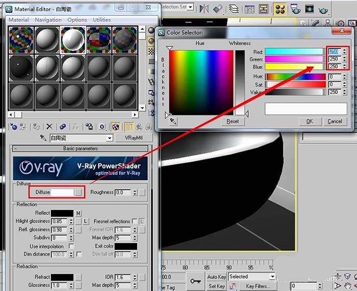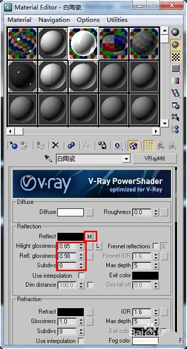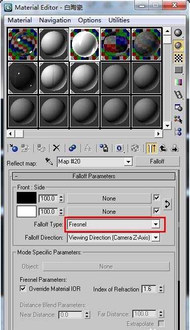 2、将当前的材质指定为【VRayMtl】(VR材质),将材质命名为“白陶瓷”,设置【BasicParameters】(基本参数),在【Reflection】(反射)通道中添加【Falloff】(衰减)贴图,其他参数的设置如下图所示。