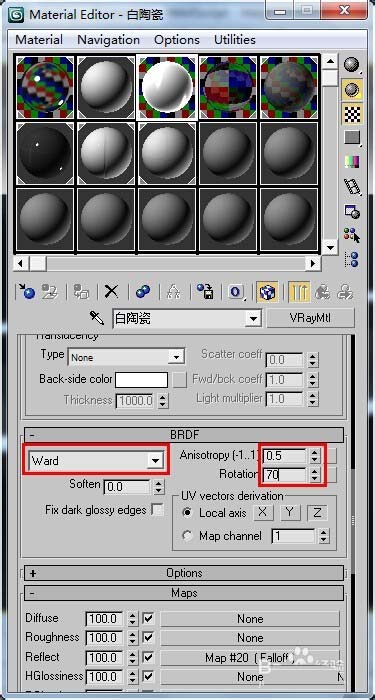 3、在【BRDF】卷展栏中选择【Ward】(沃德)类型,使用该方式渲染出来的材质整体上比较亮,调整【Anisotropy】(各项异性)参数,如下图所示。