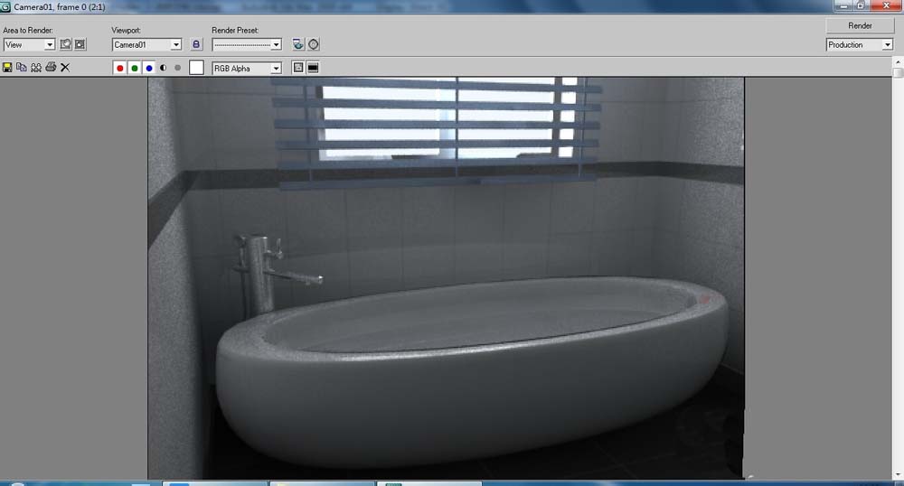 5、将调制完成的白陶瓷材质赋予浴缸,快速渲染并观察效果如下图所示。
