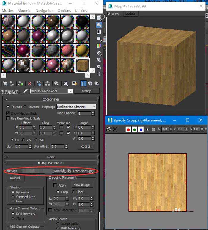 5、将设置好的材质赋予到场景中的木地板模型上,并为其添加合适的“UVW贴图”坐标,渲染即可。