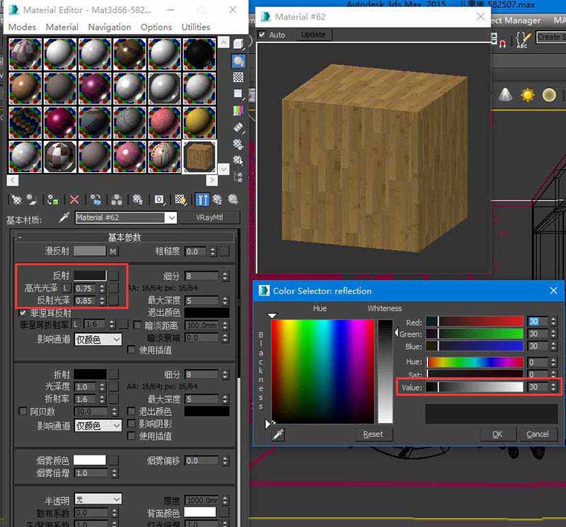 3、设置“反射”值为30,“高光光泽度”设置为0.75,“反射光泽度”为0.85。