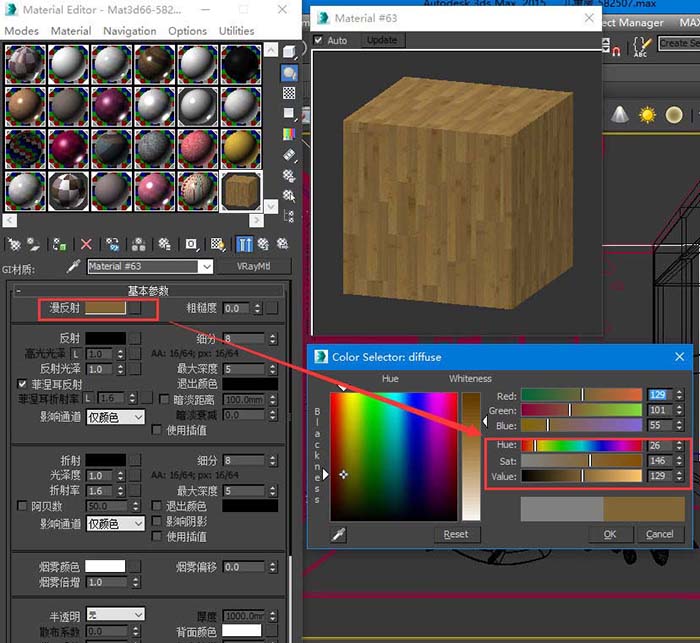 4、向上返回到“vray包裹材质”界面,进入“GI材质”子层级,选择“vray材质”,将“漫反射”值设置为接近木地板材质贴图的颜色,如(R129,G101,B55)。