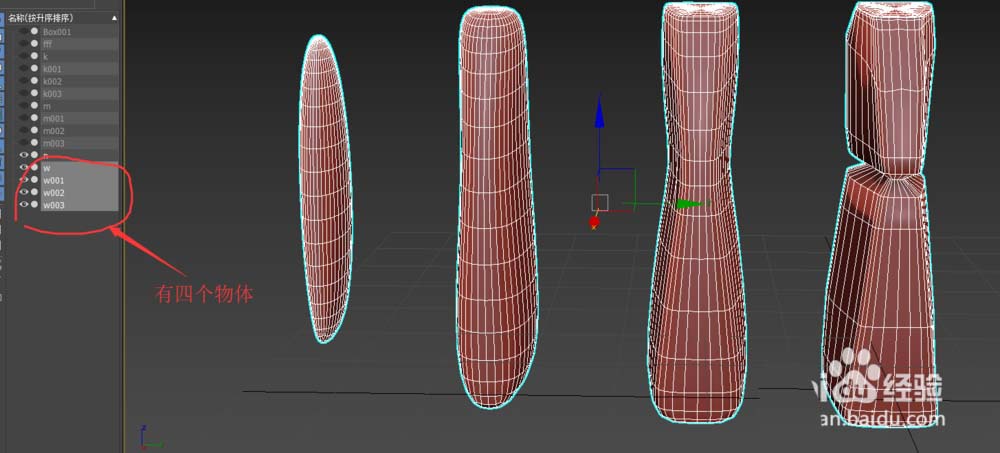 1、首先,我们有四个对象用来说明。先说合并多个对象为一个的办法。选中其中一个物体,并按下建模选项卡下的附加按钮。