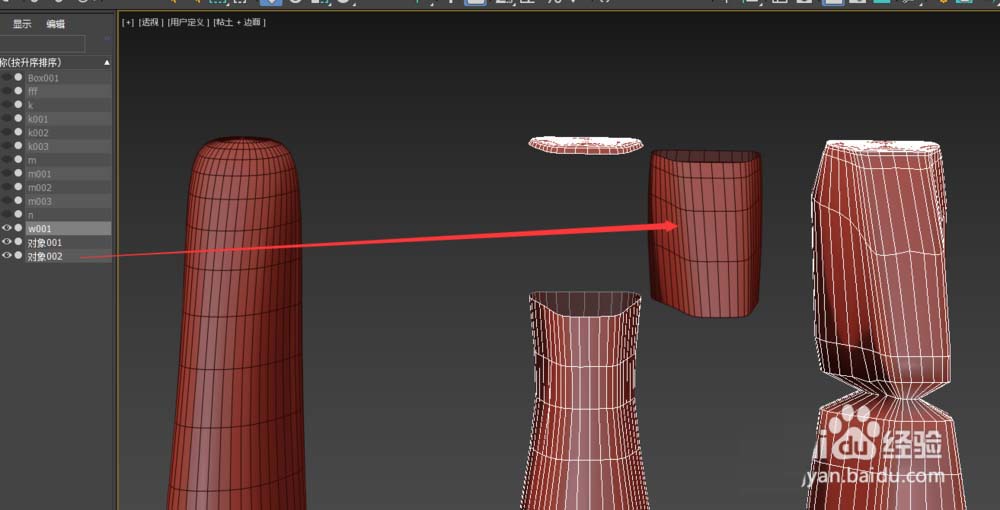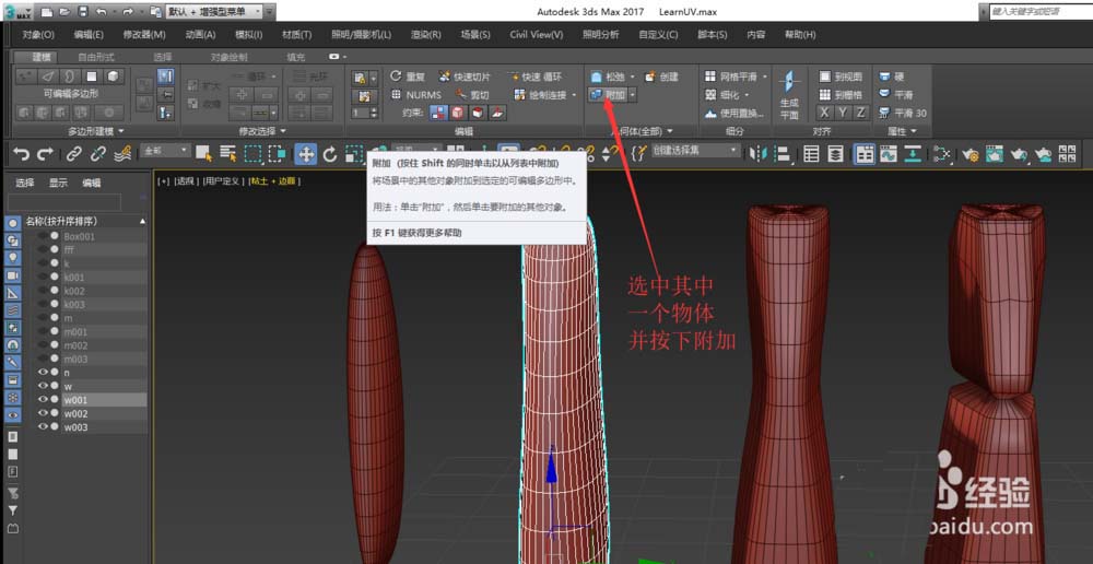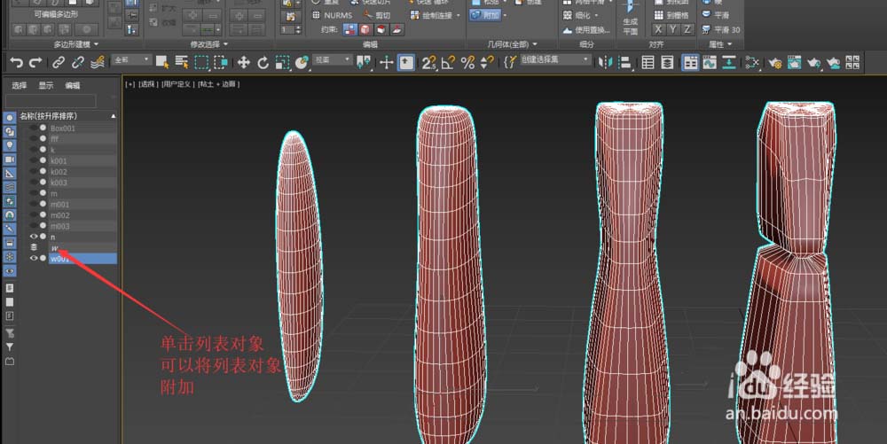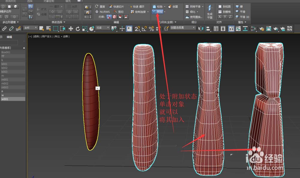 2、直接单击视图中另外的对象,就可以附加进去成为元素,同时原对象在左侧列表中消失。单击列表中的对象效果一样。