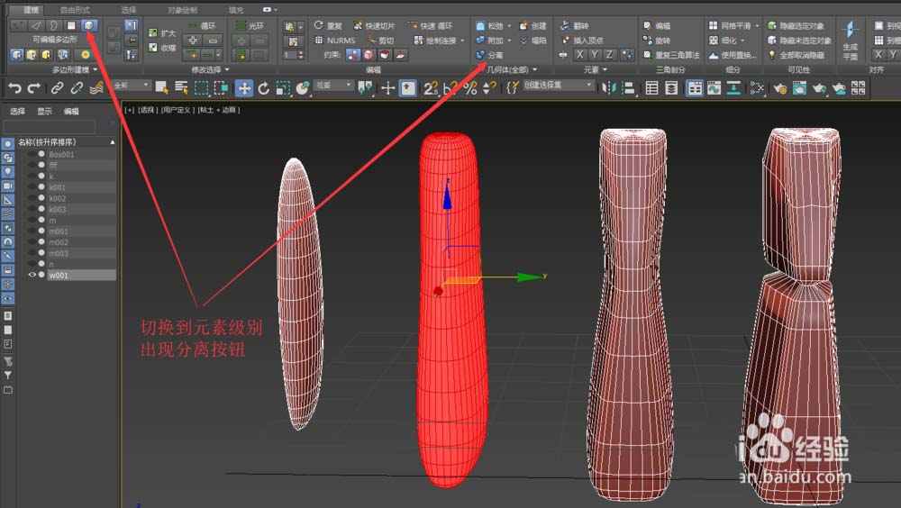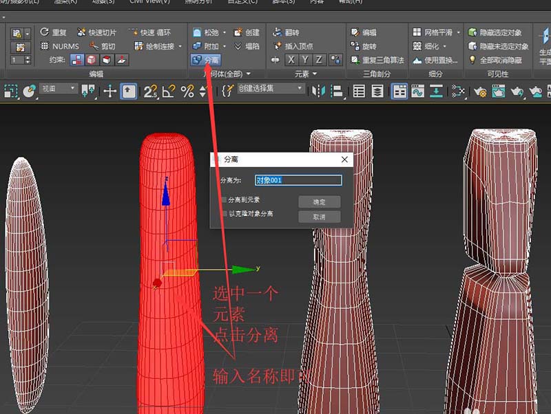 2、下面说分离元素的办法。选中一个对象,切换到元素层级,选中一个元素,点击分离,并在弹出对话框输入名称即可。默认会分离成为另外一个对象。