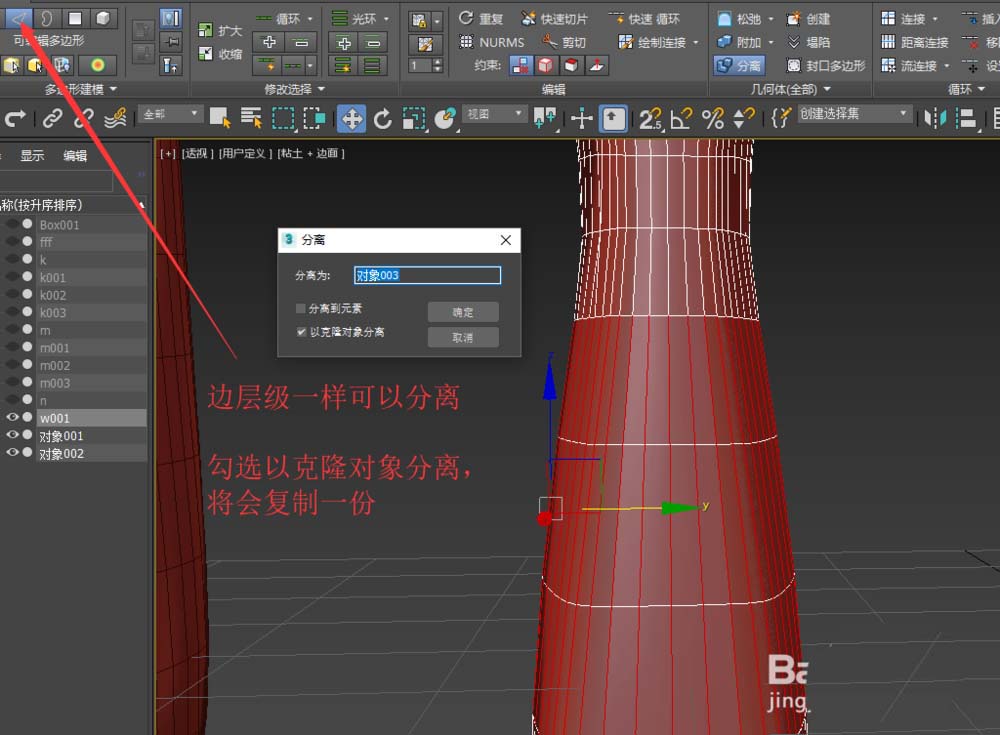 3、分离操作还可用于多边形/边/点层级。比如在多边形层级,我们选中一些多边形,点击分离,效果如图。