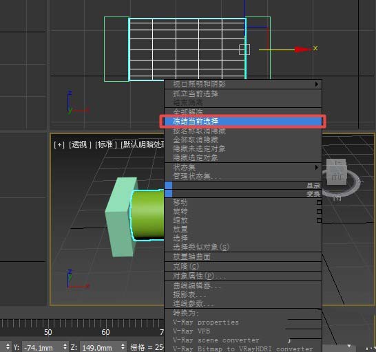 2、如果想冻结其中一个物体,如中间的圆柱体。选中圆柱体后,右键点击选择“冻结当前选择”,则冻结后的圆柱体以黑白显示冻结物体。