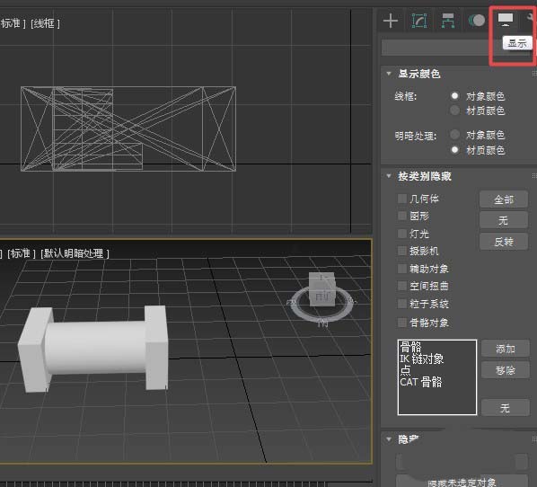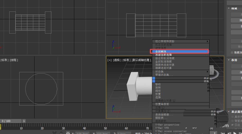 5、如果只想解冻某一个物体如中间的圆柱体。则找到显示面板。
