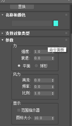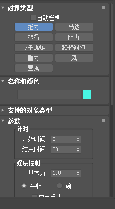 4、空间扭曲中我们可以来选择第一项也就是推力项,选择以后就会在下面出现推力的设置参数,我们可以根据自己的需求去进行设置,如图