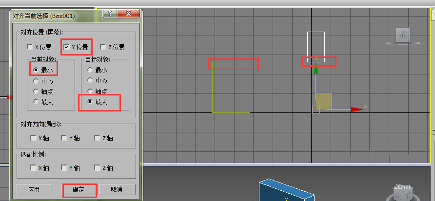 5、我们在对话框中选择Y位置,当前对象选择最小,目标对象选择最大,确定,这样右侧长方体的下边和左侧长方体的上边就对齐了,如图所示。