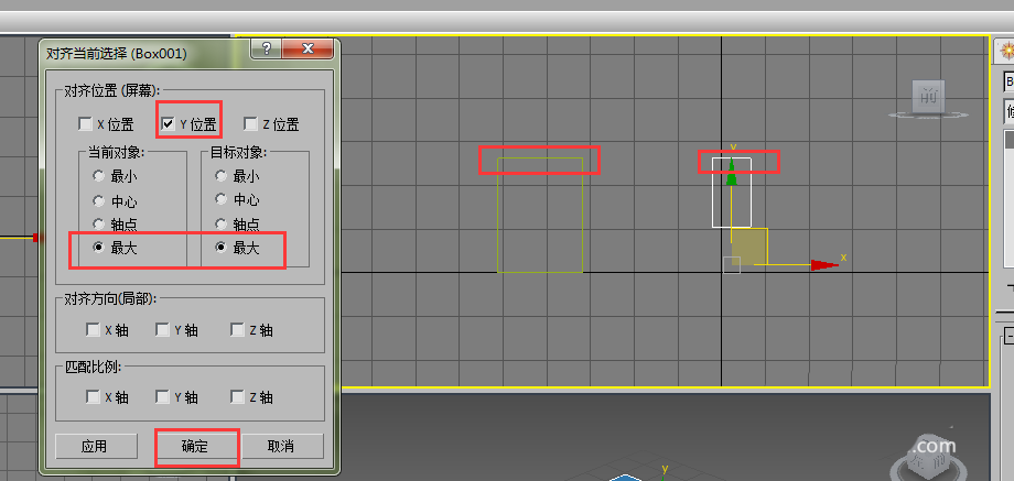 6、如果想让右侧长方体的上边和左侧长方体的上边对齐,那我们就选择“Y位置”,当前对象选择最大,目标对象也选择最大。确定。如图所示,就对齐了。