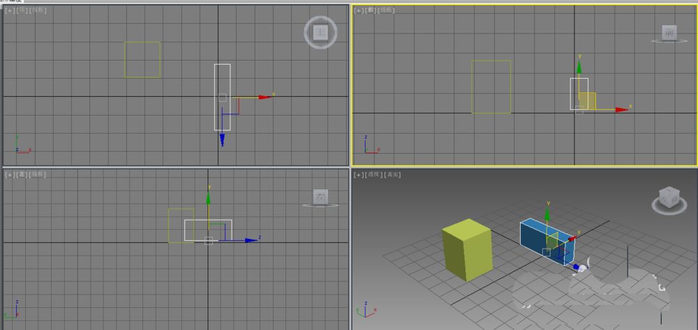 2、切换到前视图,我们要求右侧的长方体的顶边与左侧长方体的顶边对齐,要用到工具栏中的对齐按扭