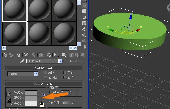 7、选择立体圆形,单击【将材质赋予指定对象】的按钮。然后,选择立体圆形,单击【将材质赋予指定对象】的按钮,这样就可以把木纹材质贴到立体圆形上了,如下图所示。