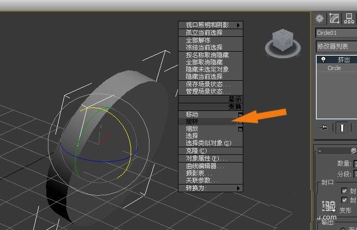 9、通过旋转方式,把立体圆形立起来,摆正。然后,选择立体圆形,右键菜单选择旋转,通过旋转方式,把立体圆形立起来,摆正,如下图所示。