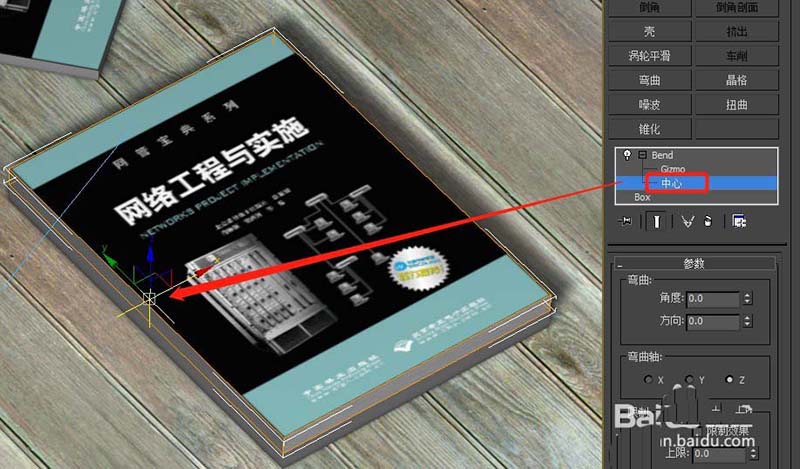 2、在“弯曲”修改器的子层次选择“中心”,移动其弯曲中心轴到左侧位置,即书本的最左边沿;然后点击开启动画的关健帧,在0帧位置保持目前状态,不用做什么;
