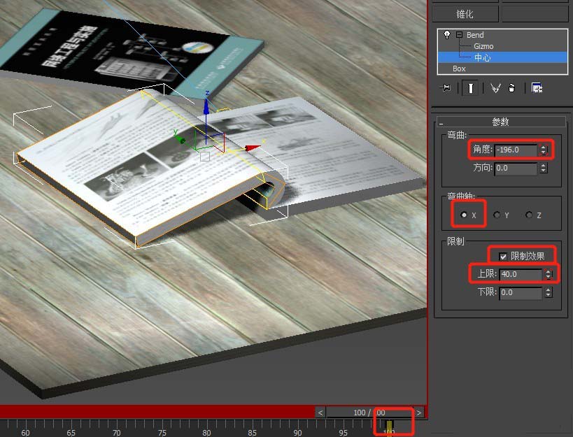 3、然后拖到100帧位置,在“弯曲”修改器内,把角度、方向、上限按题目要求输入对应框里;这样这个动画就制作好了,点击播放按钮(快捷键“?”)就会看到书本弯曲、翻起、落下、展开的一系列效果。