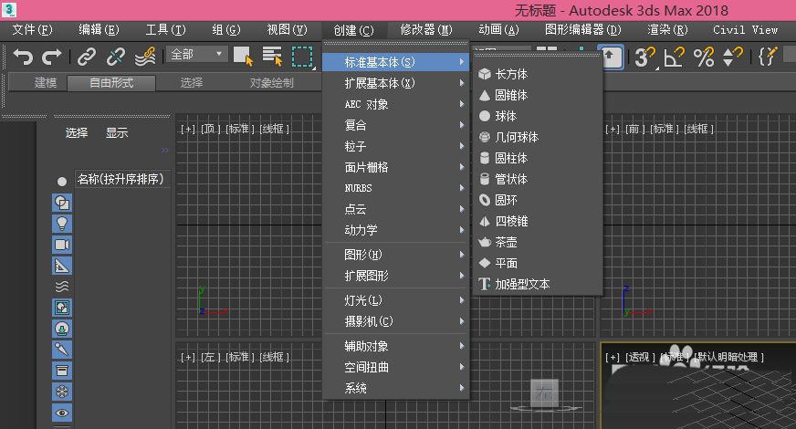 3、我们可以在最上面的主菜单栏中来找到创建选项,打开创建就可以看到标准基本体,我们介绍的这两种图形就在标准基本体中,如图