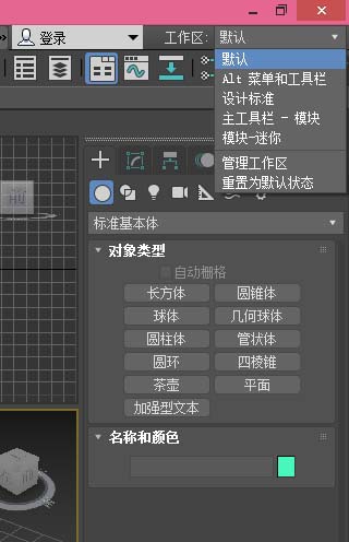 3、一般3ds Max刚打开以后的工作区是默认的,我们可以选择其它的工作区,在右上角可以看到工作区的选择,如图