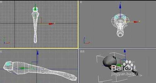 进入修改命令面板,进入“图形”次物体层级进行编辑,使嘴部的根部稍微粗大一些。进入创建命令面板,创建一个“球体”作为复眼,使用“选择并非均匀缩放”工具进行拉伸变形;然后继续使用“编辑网格”工具对躯干部分进行编辑。