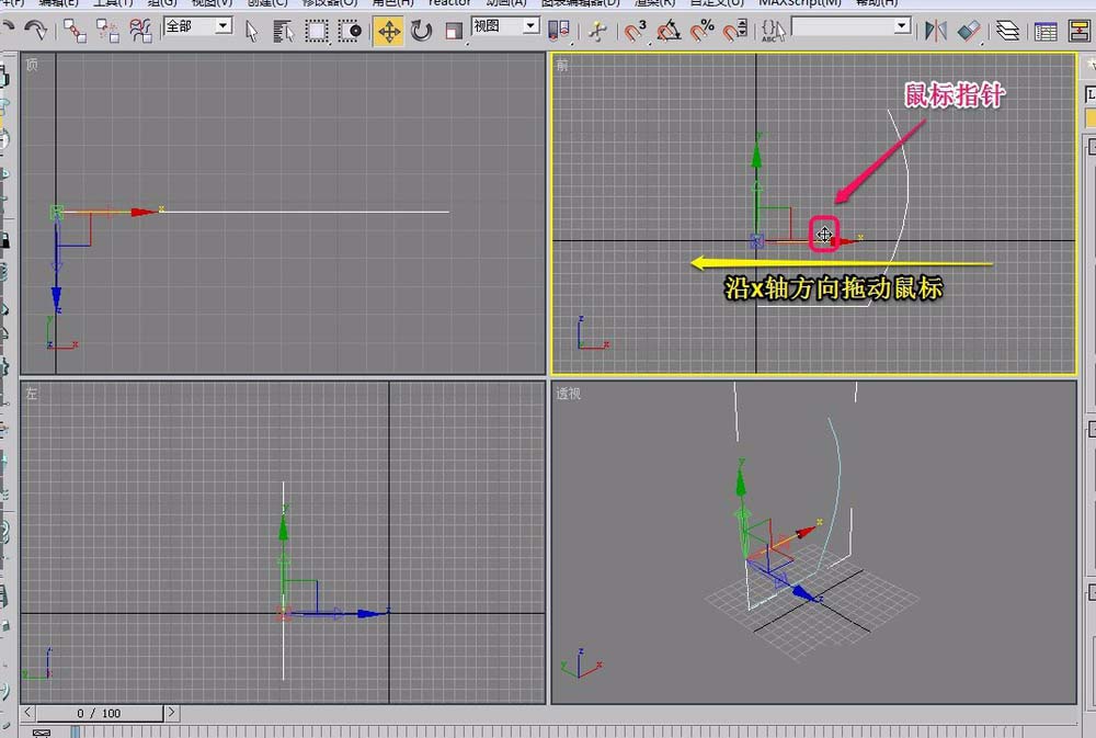 5、使用鼠标拖拽图形的局部坐标沿着x轴移动一段距离,使得轴心和缸的截面的底部左边界在z轴方向上在一体直线上。