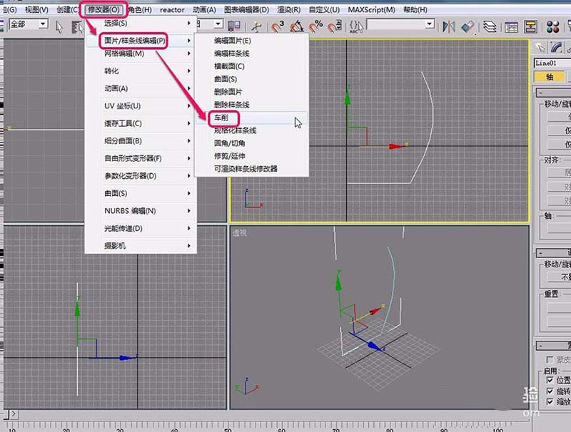 7、打开“修改器”菜单,选择“面片/样条线编辑”项中的“车削”命令。