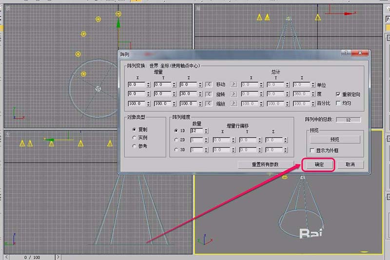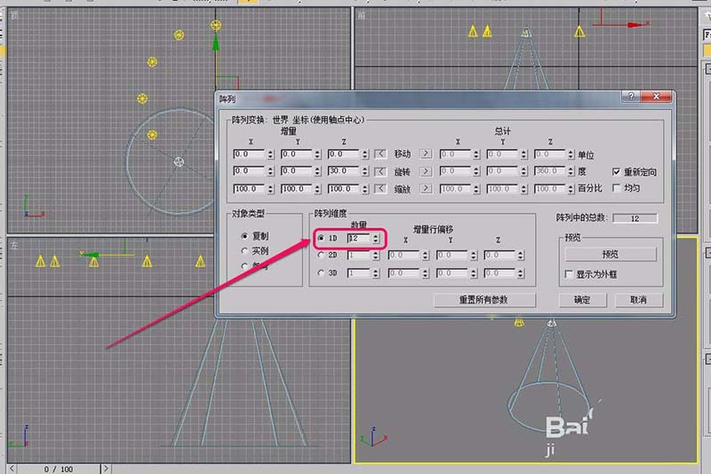 9、接下来,我们选择“阵列维度”中的“1D”项,将数量设置为 12,表示让软件阵列出 12 个自由聚光灯。