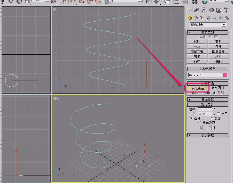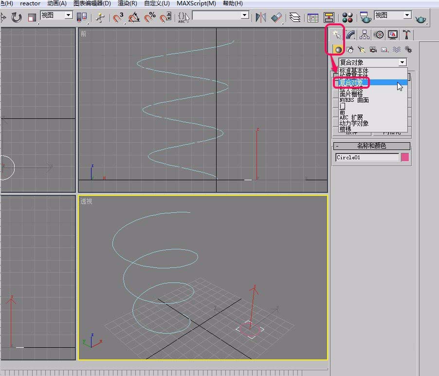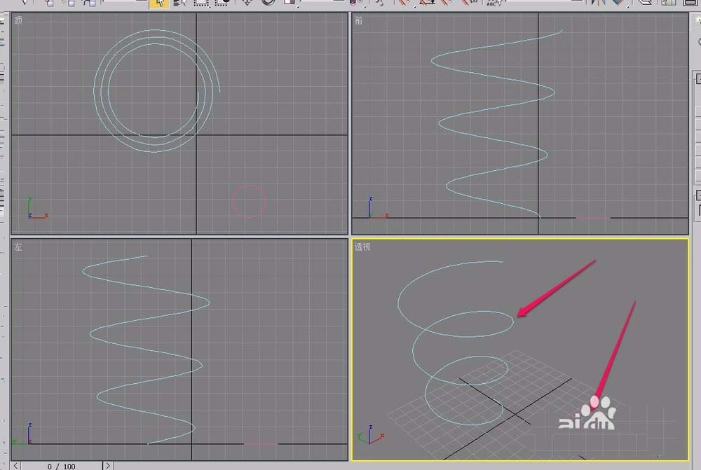 1、打开3ds max软件,新建一个螺旋线和一个圆形。