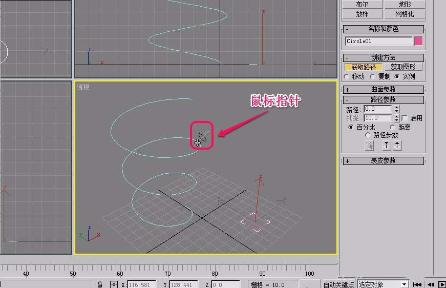 6、移动鼠标指针到螺旋线上,当指针变成图示的形状时,单击鼠标。