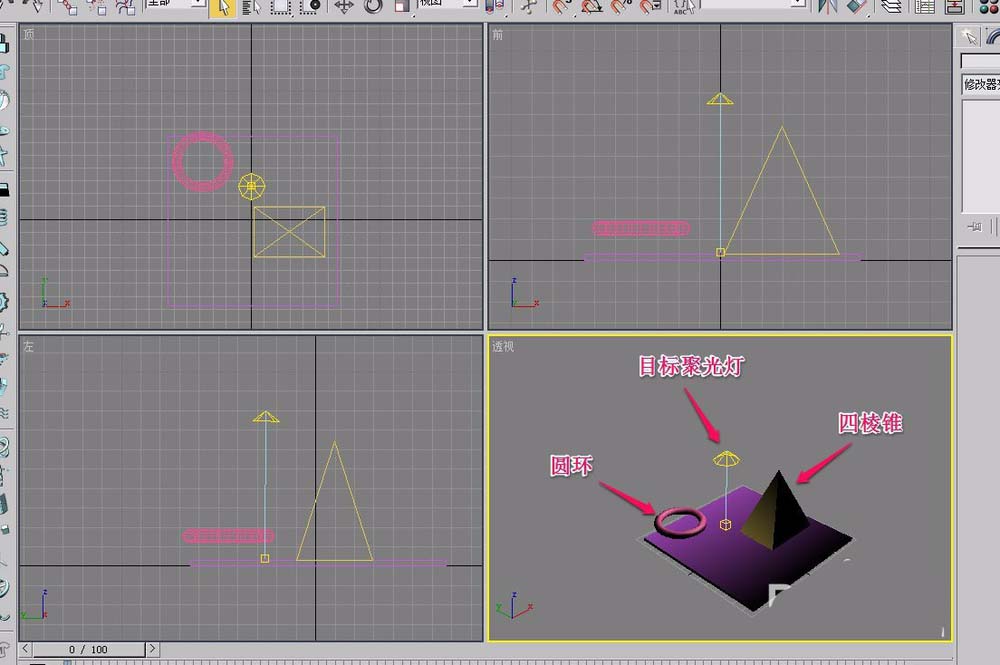 1、打开3ds max软件,新建一个圆环,一个四棱锥,放置一个目标聚光灯。