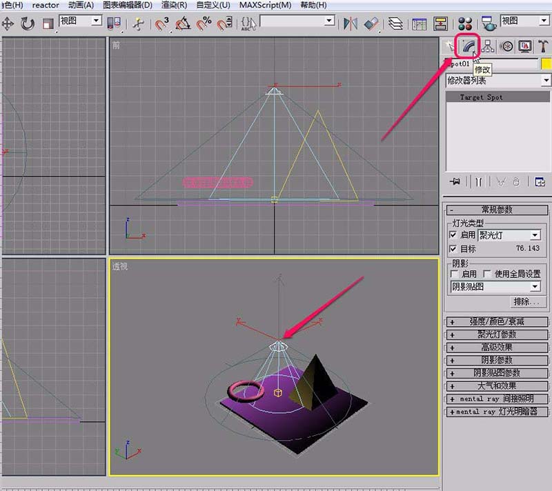 2、用鼠标选中目标聚光灯,打开“修改”选项卡。