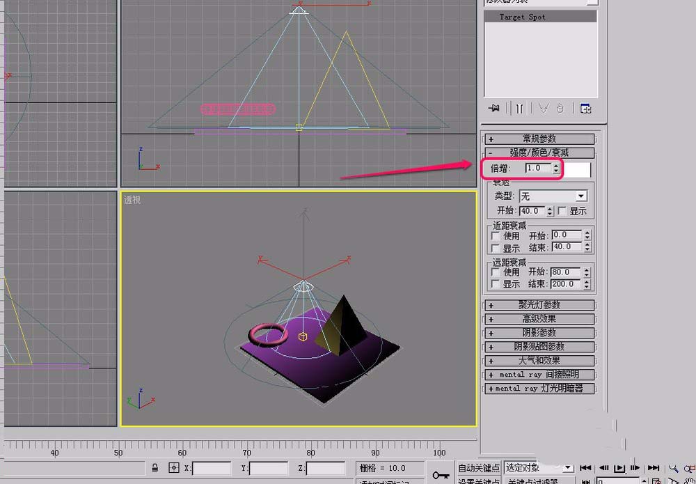 4、“倍增”,默认是1.0 ,随着数值的增减,聚光灯的照射强度也会跟着增减。