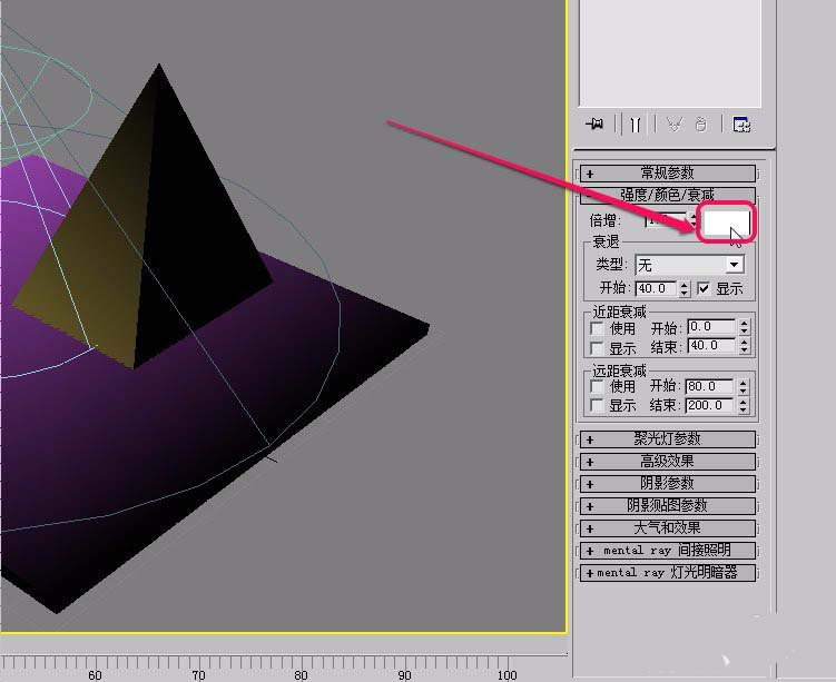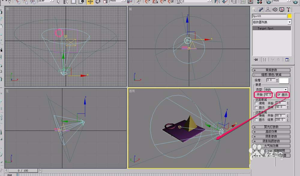 12、当勾选“显示”项,并且“开始”项输入40.0时,在光线的照射方向上出现了一个绿色图示,这是光线开始衰退的位置距离光源40个单位的距离。