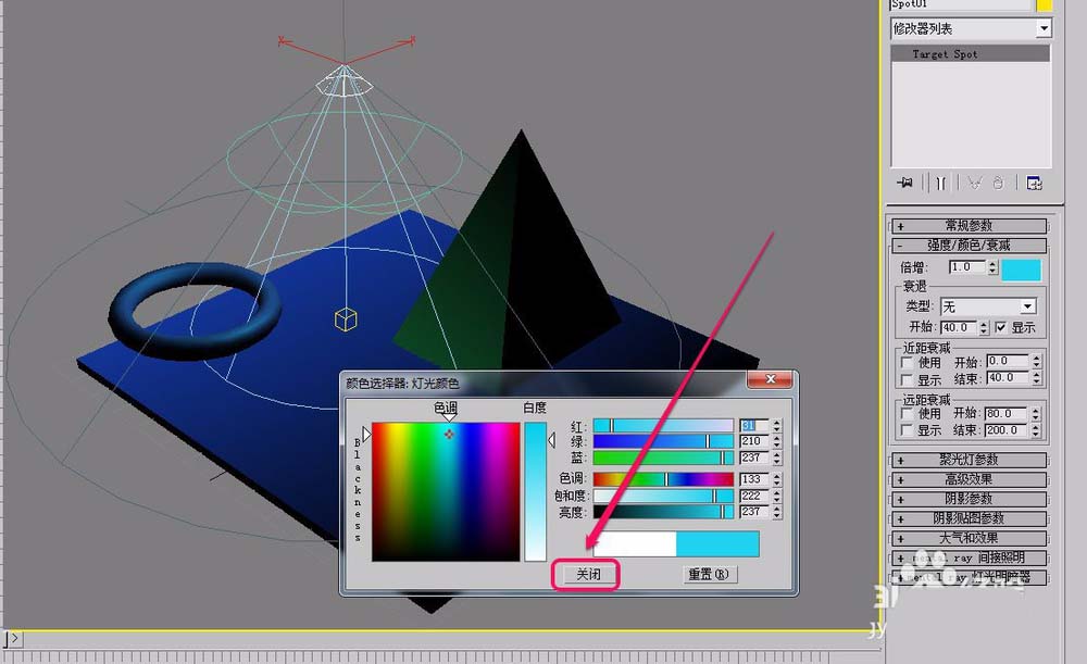 8、最后单击“关闭”按钮。可以看到,场景灯光颜色发蓝。