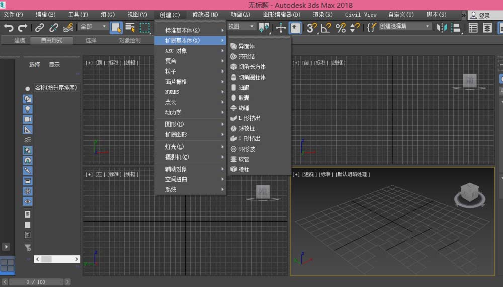 3、从最上面的操作栏中来找到创建选项,打开创建就可以看到扩展基本体,我们说的软管就在扩展基本体中,很容易找到,如图