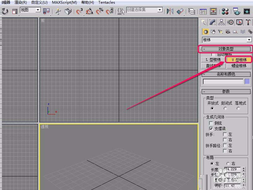 3、打开“对象类型”卷展栏,单击“U型楼梯”按钮。