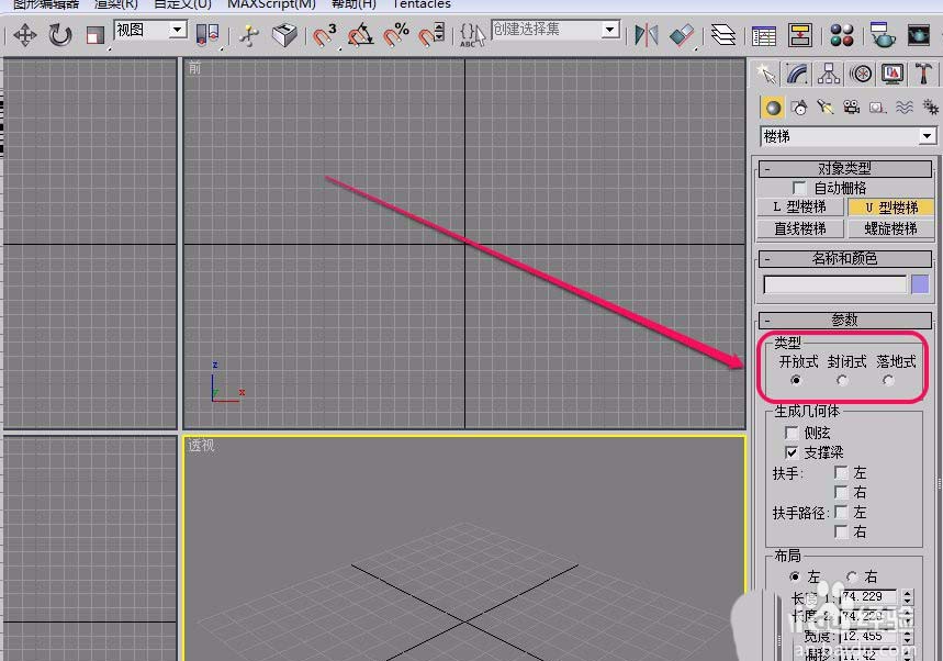 5、打开“参数”卷展栏,在“类型”中选择一种楼梯类型,默认是“开放式”。