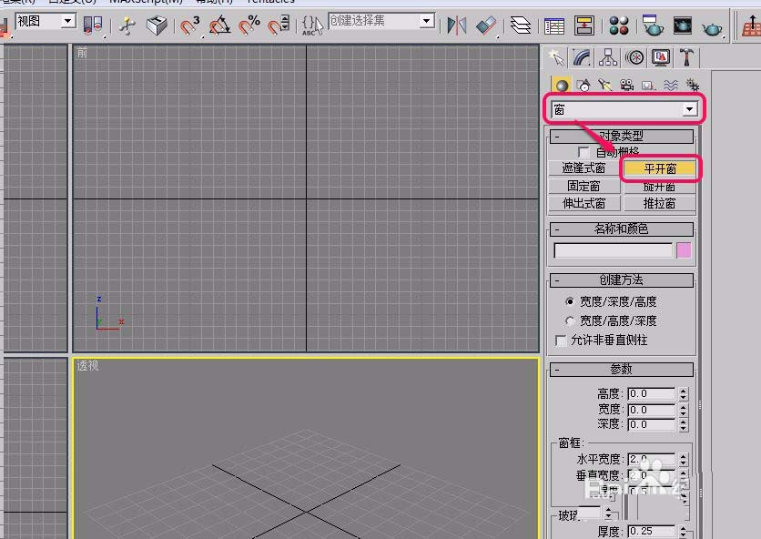 3、选择“窗”选项,打开“对象类型”卷展栏,单击“平开窗”按钮。