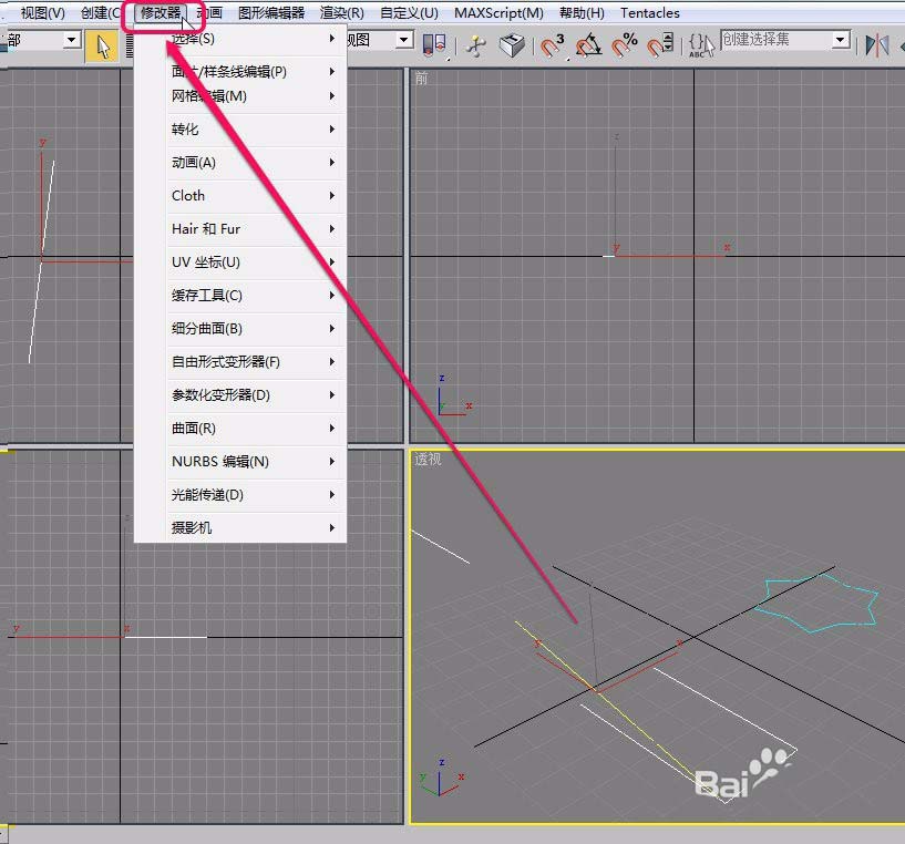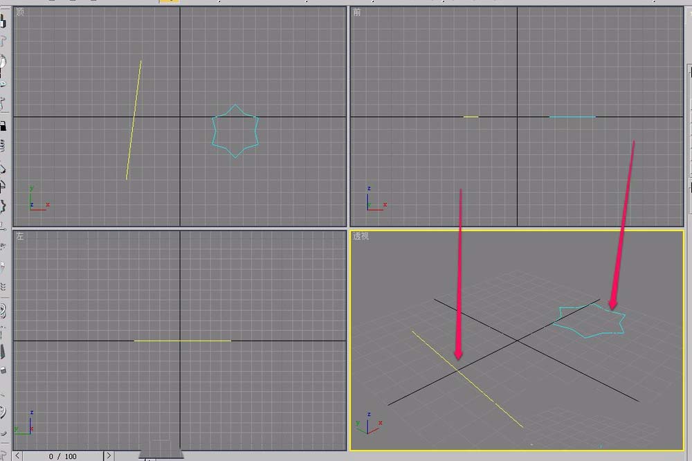 1、打开3ds max软件,在视图中创建若干平面图形。1条直线,1个多边形。