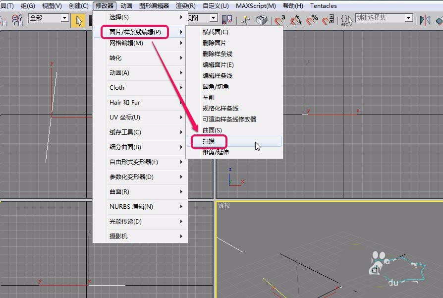 3、选择“面片/样条线编辑”中的“扫描”命令。