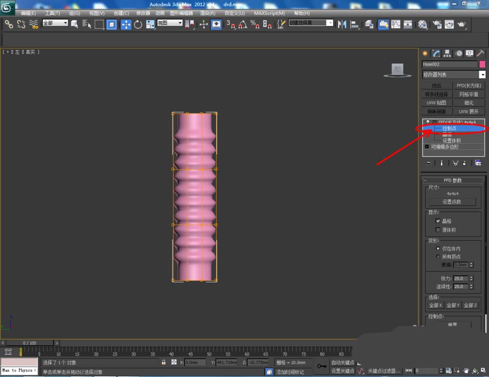 3、选中模型,点击【FFD(长方体)】,点击右边工作栏中的【设置点数】,按图示设置好参数后,点击【控制点】,对控制点进行旋转和移动调整(如图所示);