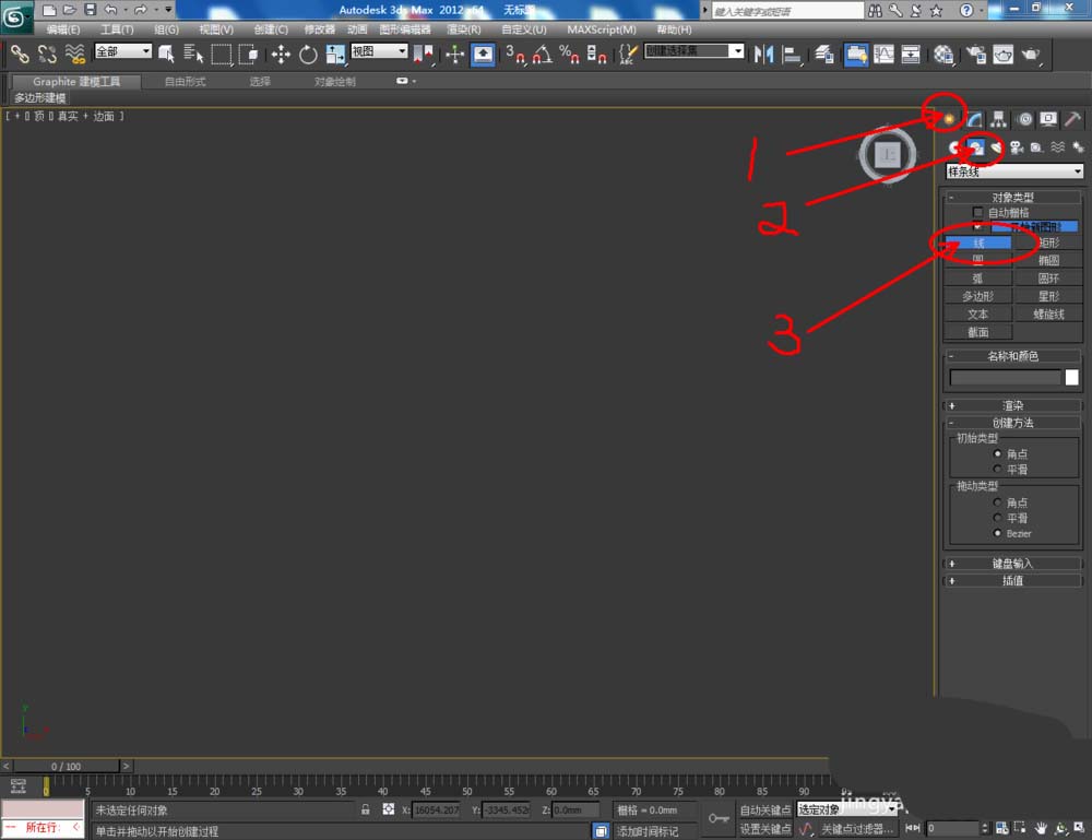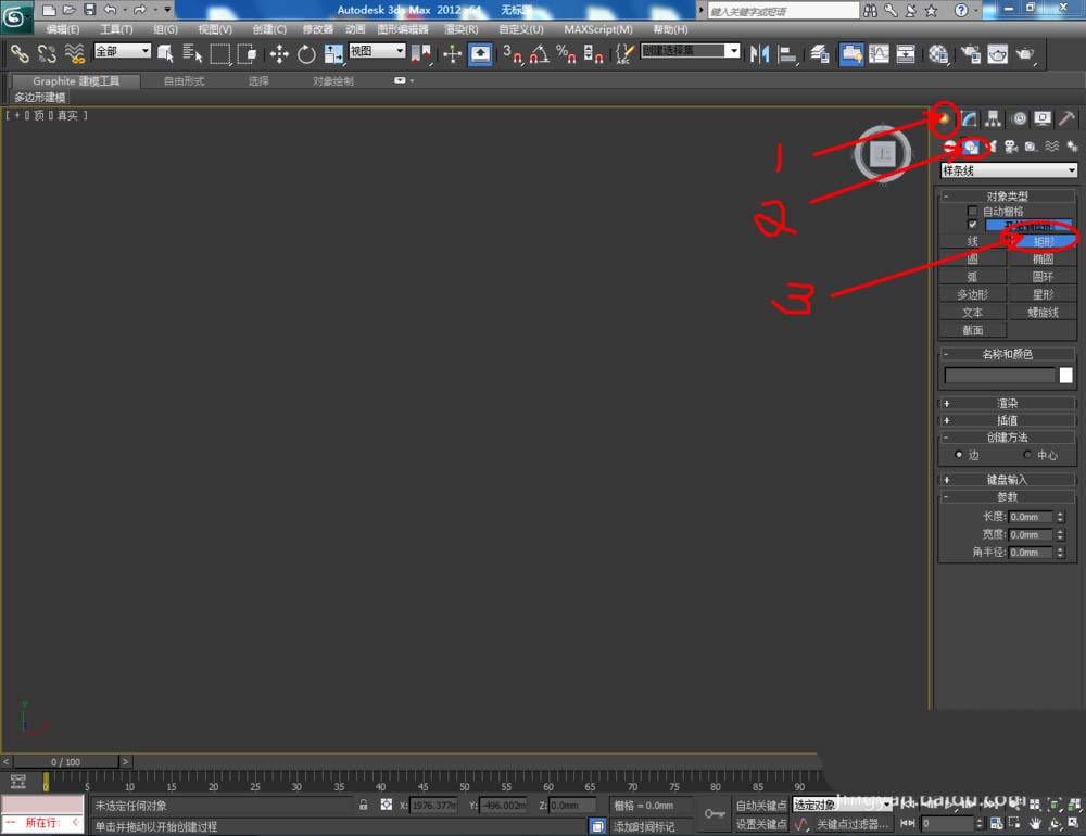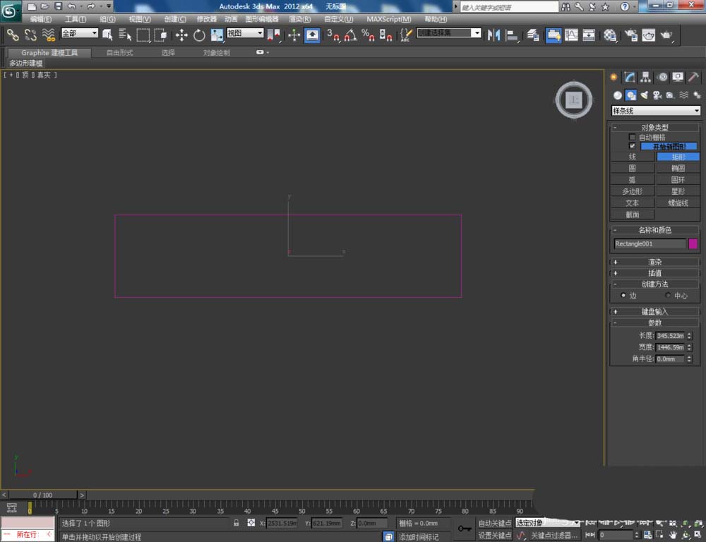 1、打开3Dmax2012软件,点击【创建】-【图形】-【矩形】,在作图区域绘制一个矩形图案,并将【对象颜色】设置为白色;