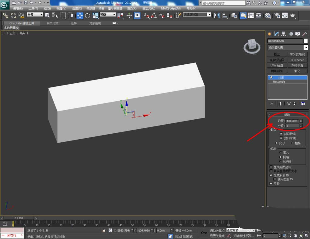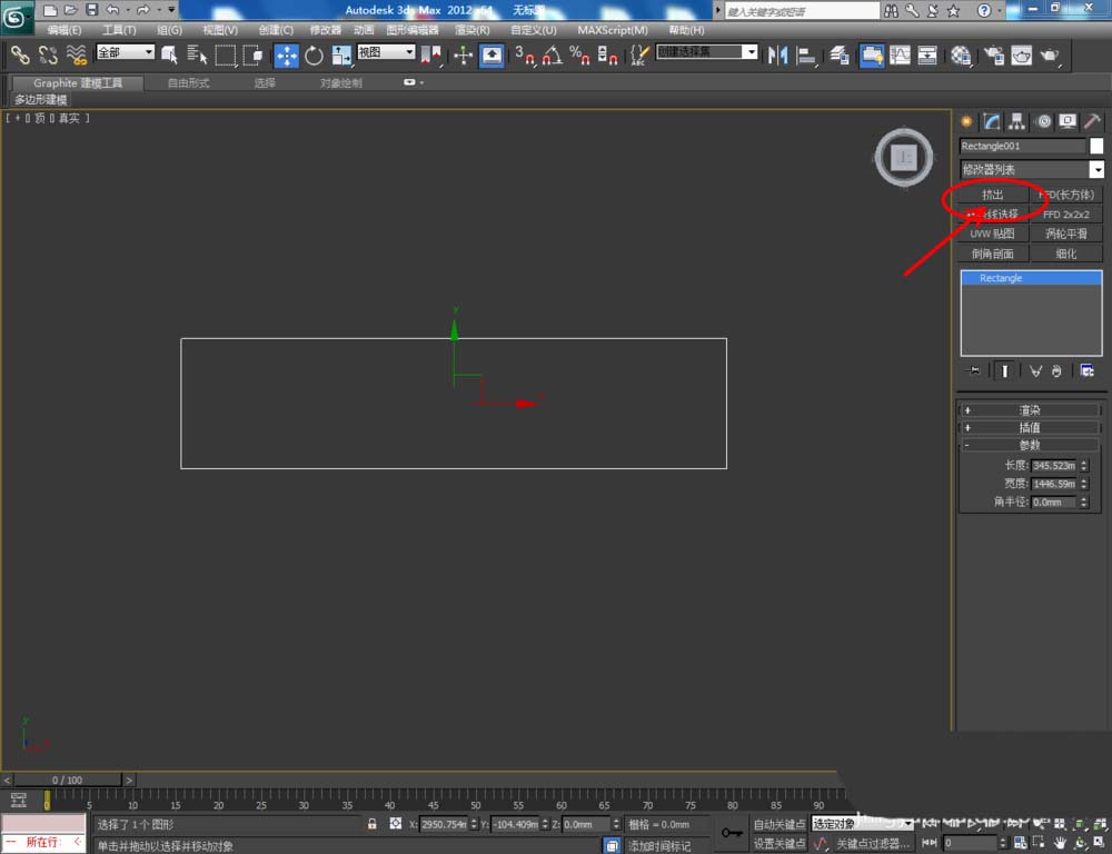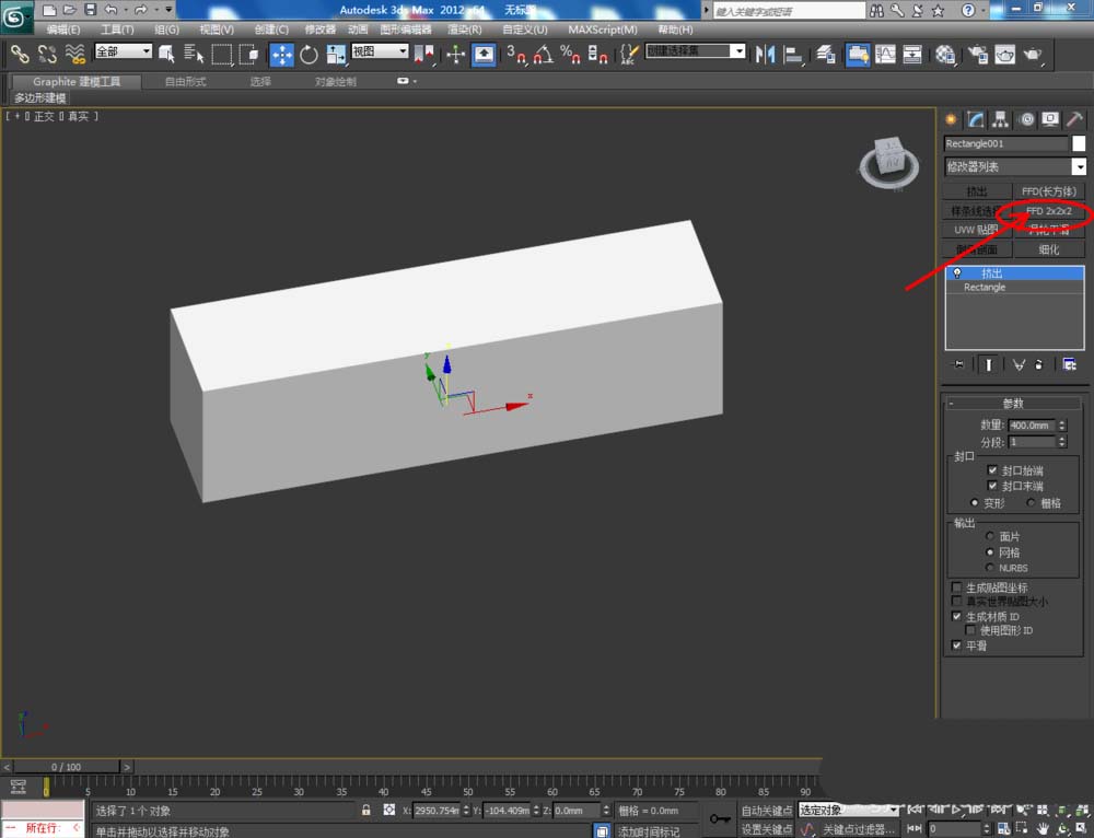 2、选中矩形,点击【修改】-【挤出】,并设置好挤出数量。选中模型,点击【FFD2*2*2】,鼠标点击工作栏中的【控制点】后,选中底部四个控制点进行缩放(如图所示);