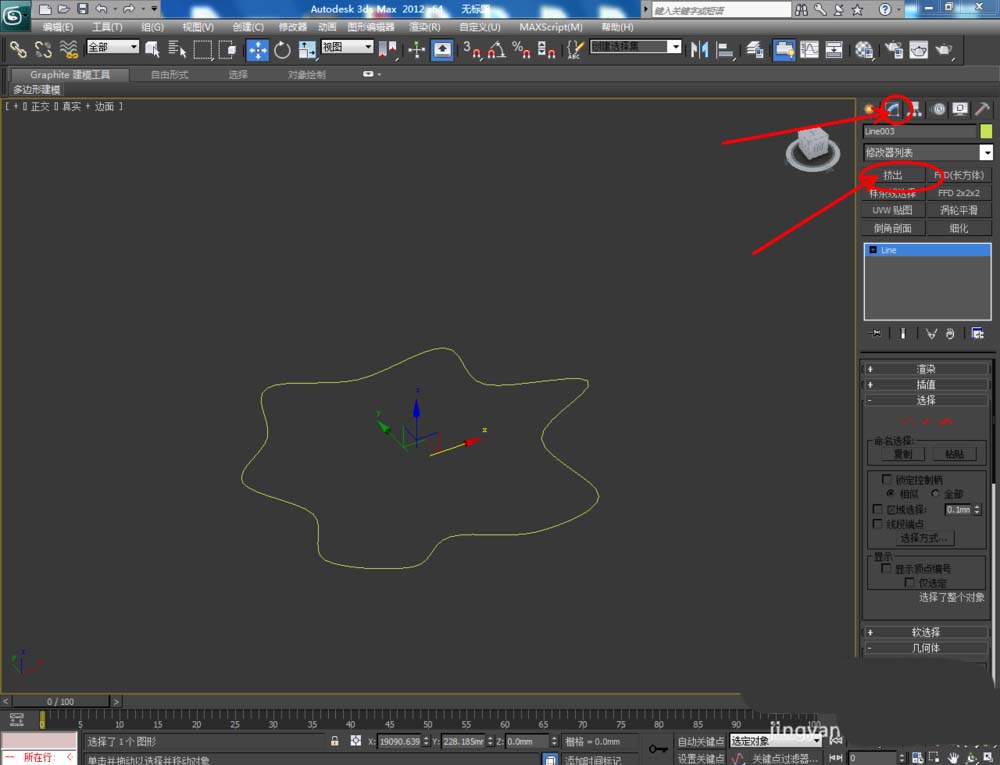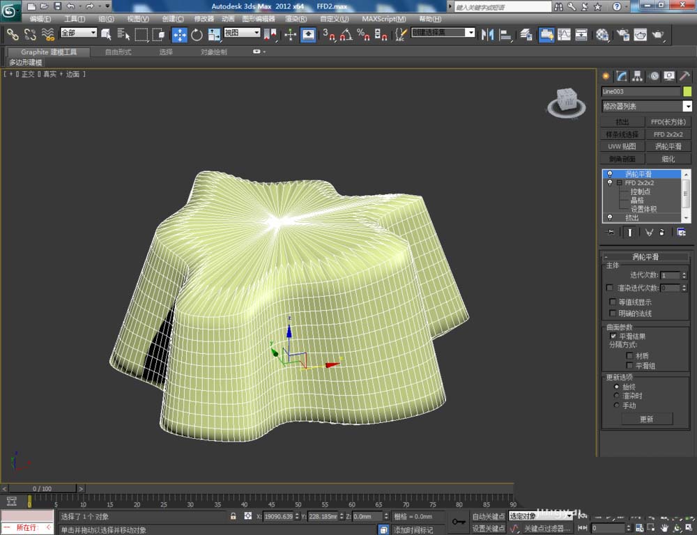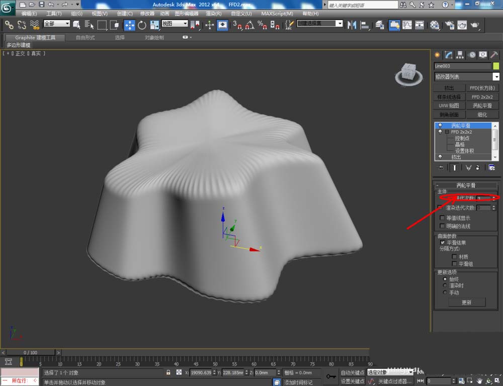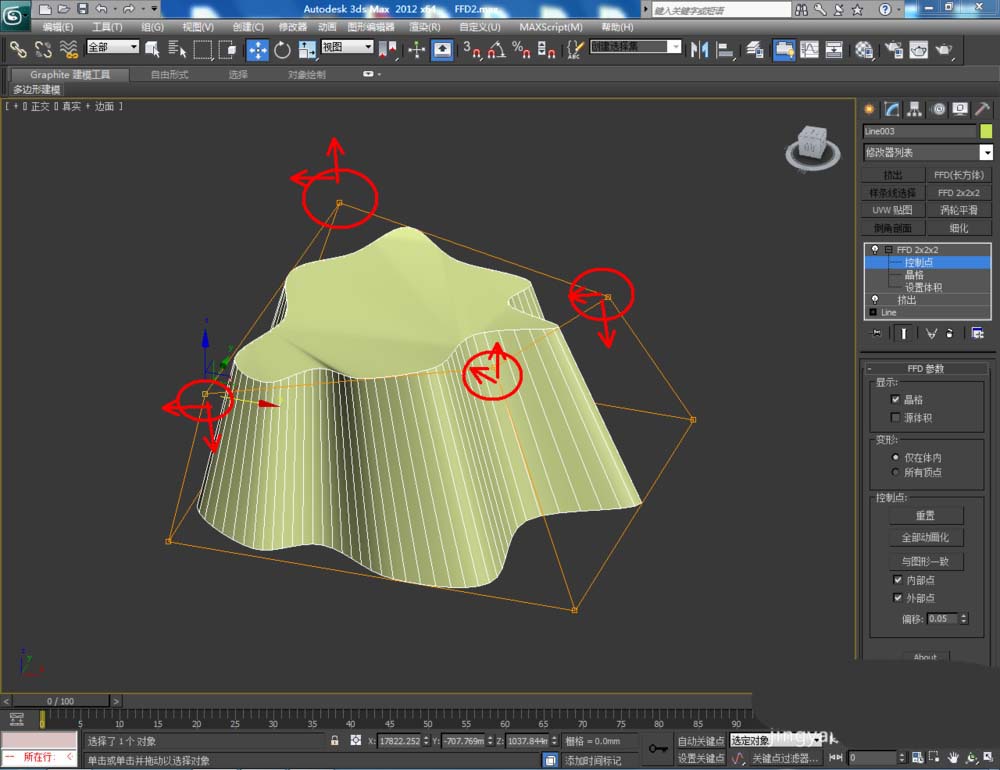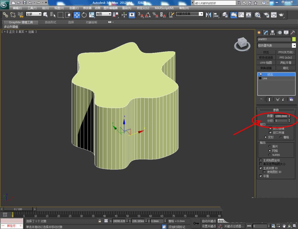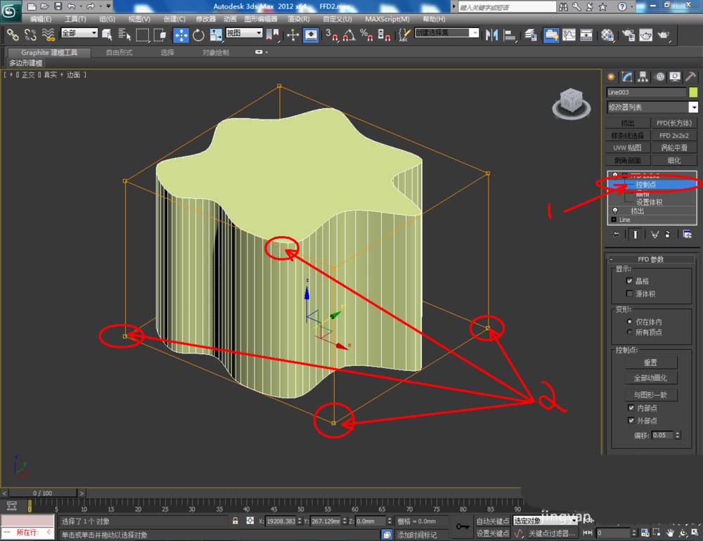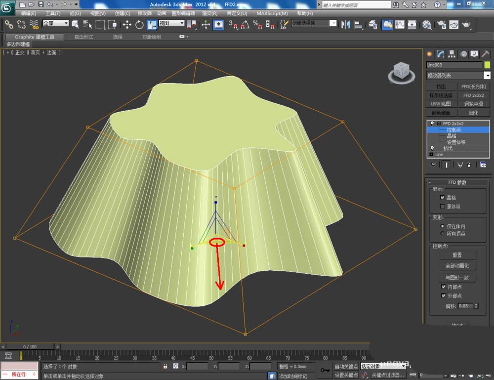 4、选中异形图案,点击【修改】-【挤出】,按图示设置好挤出数量。完成后,点击【FFD2*2*2】(如图所示);
