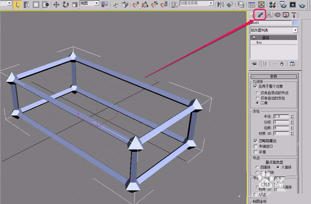 1、打开3ds max软件,创建一个长方体,并且已经应用了“晶格”变形器。