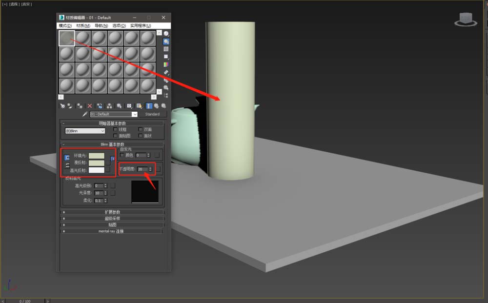 1、有的朋友需要使用VR材质,这个方法我们以VR材质来示例,我们要让圆柱虚化,看见后面的图形。