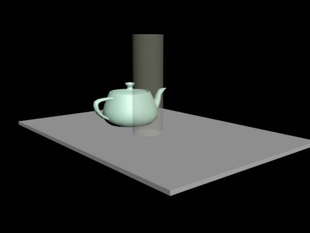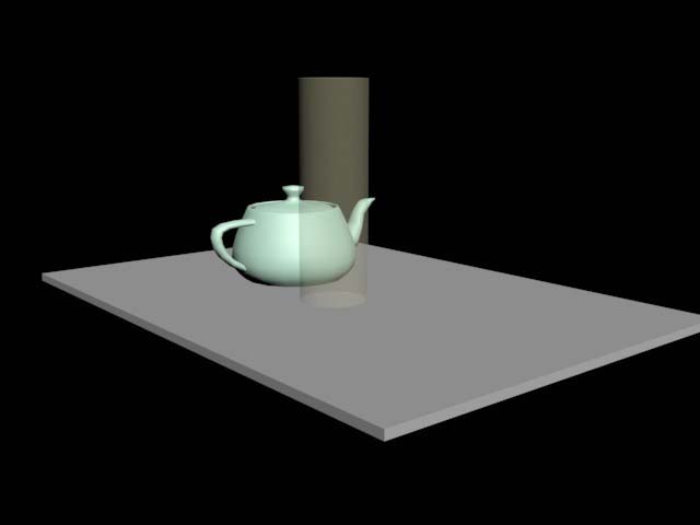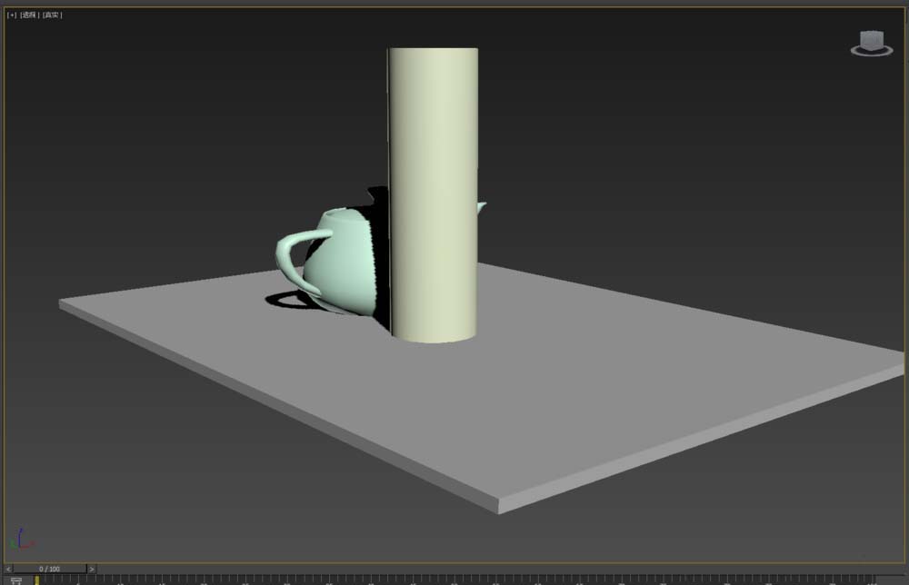 1、打开需要调整的模型,这里以简单的模型示例。这个角度渲染的时候,前面的圆柱把后面的茶壶遮挡住了,我们要让圆柱虚化,看见后面的图形。