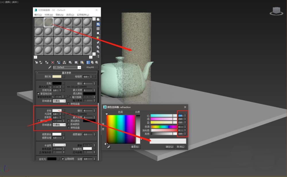 2、这里新建一个VR材质,颜色反射根据自己模型的特性调整。下面点开折射,设置为浅白色(这里设置的是210,210,210,具体数值根据自己需求),折射率设置为1(不设置为1就是类似玻璃和水的折射了)。点击渲染